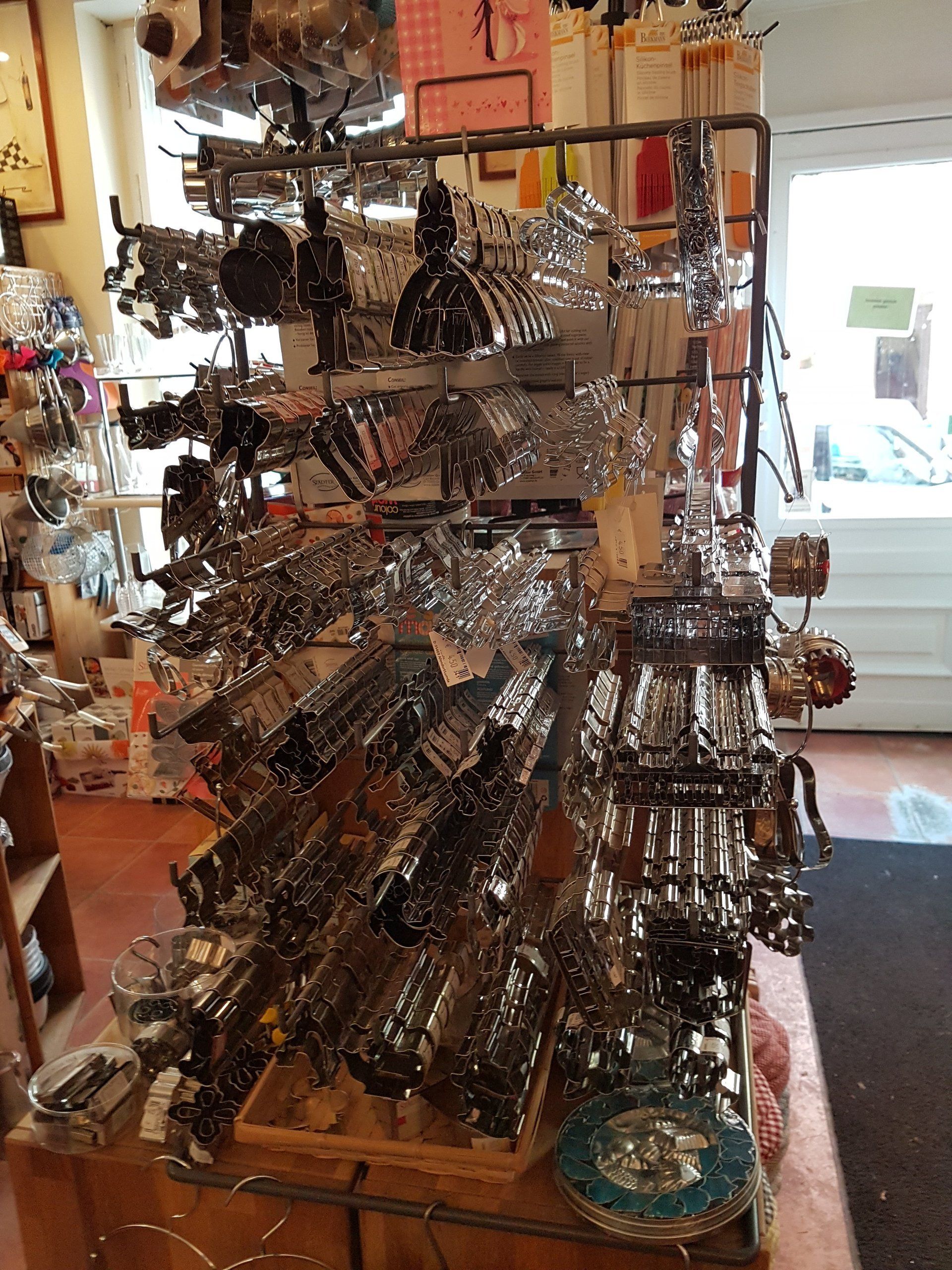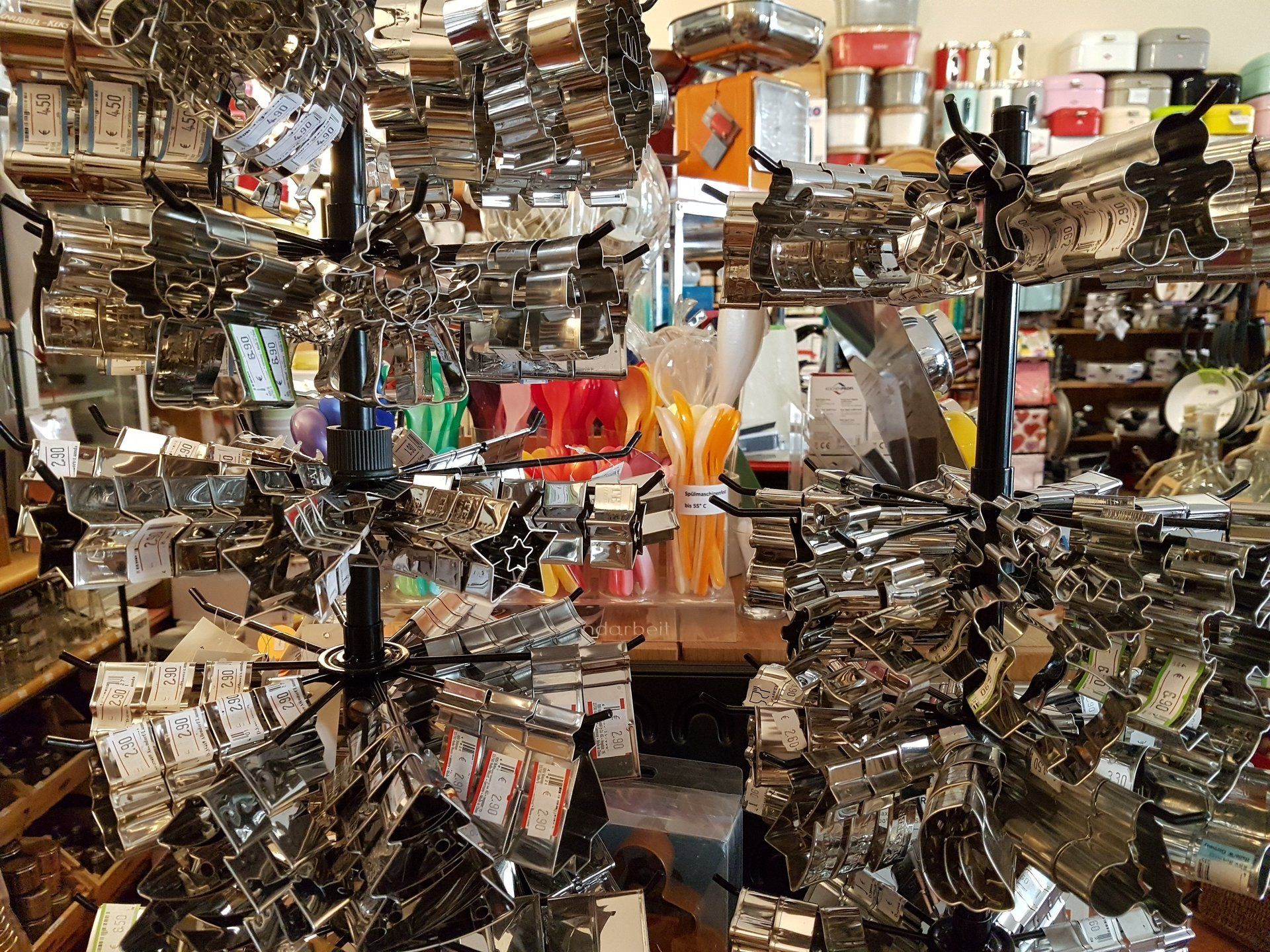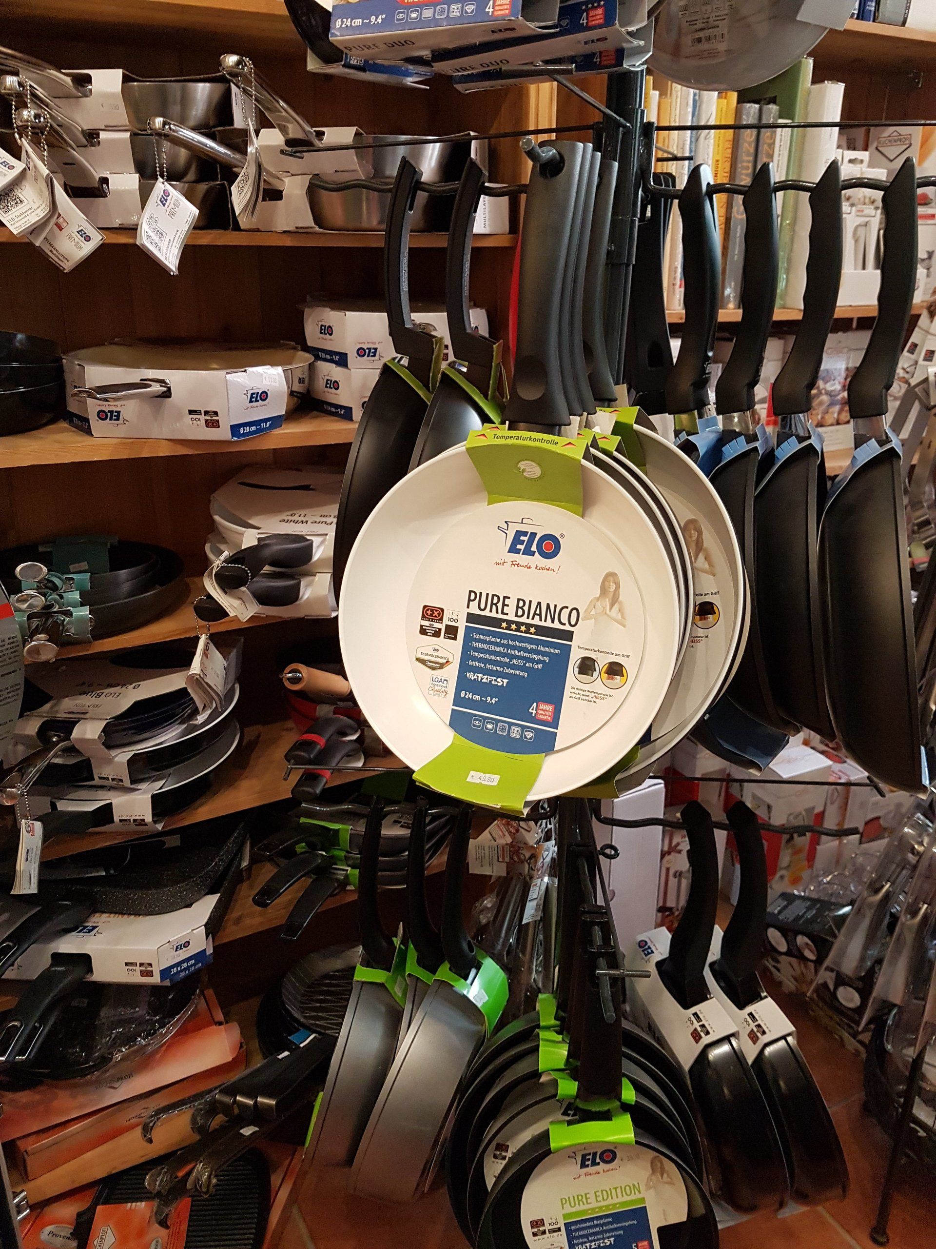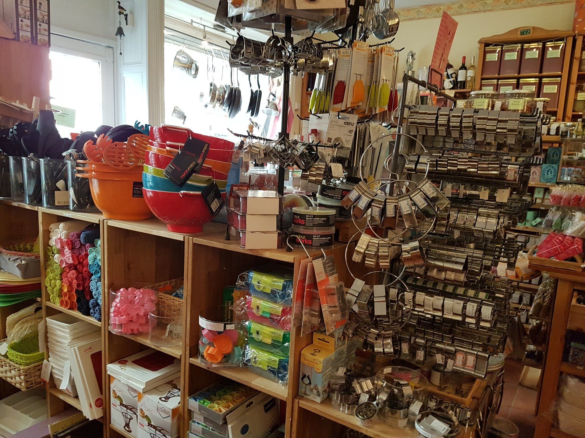 wie Reiben und Hobel aller Art, Pfeffer-, Salz-, Muskat- u. Gewürzmühlen, eine große Auswahl an Gewürzgläsern, hochwertige Töpfen und Pfannen, Schüsseln, Brotkästen, Bretter aus Holz und hochwertigem Kunststoff, allerlei Holz-Küchenutensilien, auch aus Olivenholz, Auflaufformen, Bräter, Messbecher, ein ausgewähltes Messersortiment, ausgefallene Küchenhelfer, wie Trüffelhobel, Austernbrecher, Spicknadeln, Zuckerthermometer und alle möglichen anderen Thermometer (Brateneinstich-, Flüssigkeit- Ofen-und Kühlschrankthermometer und vieles mehr...