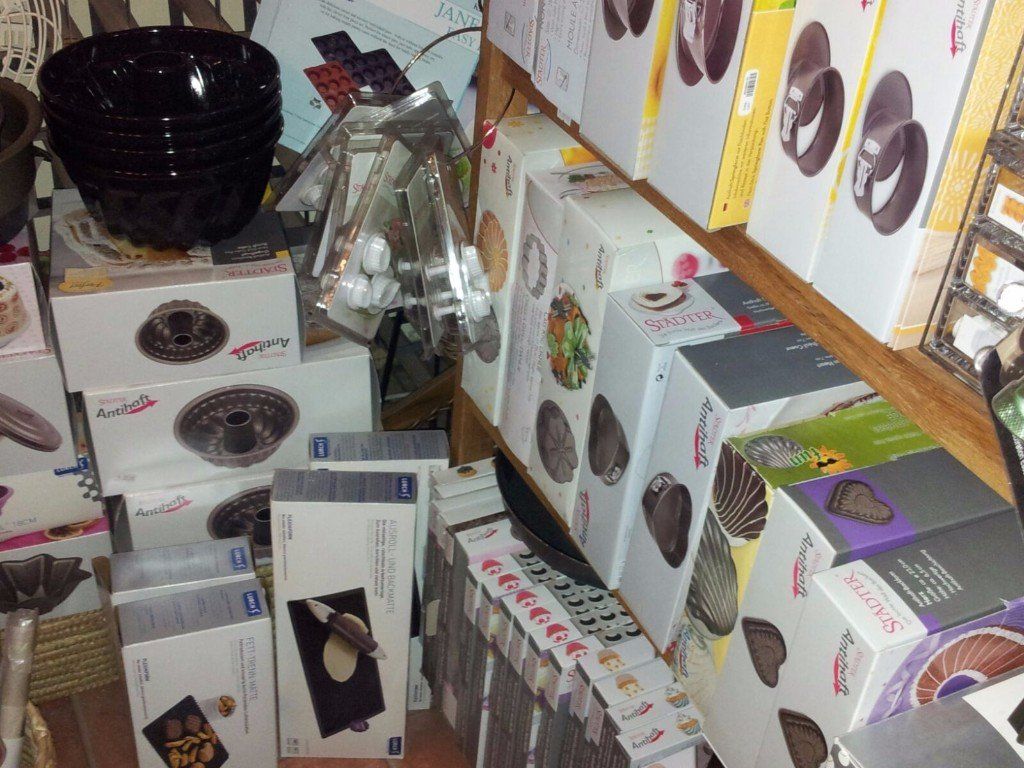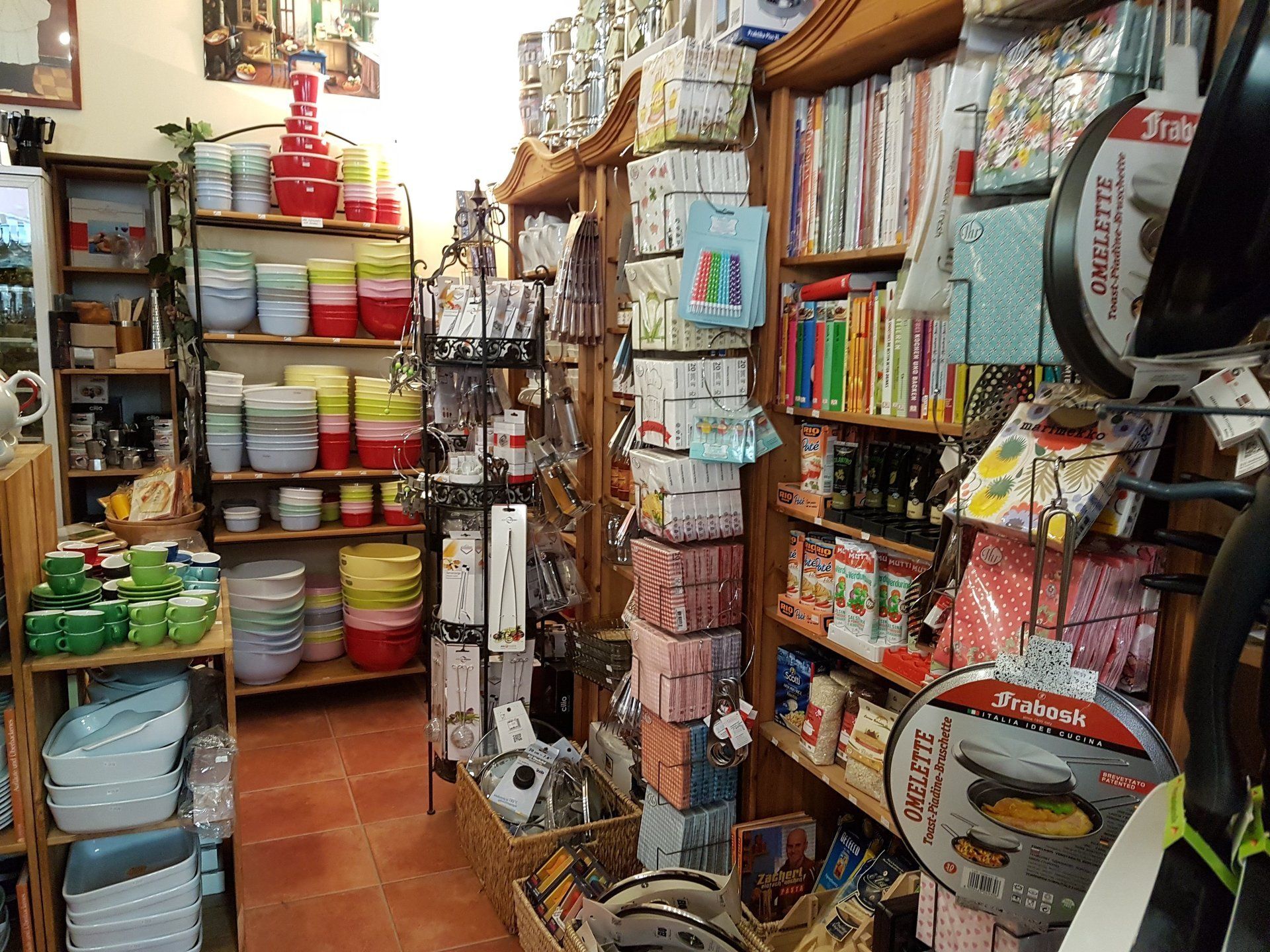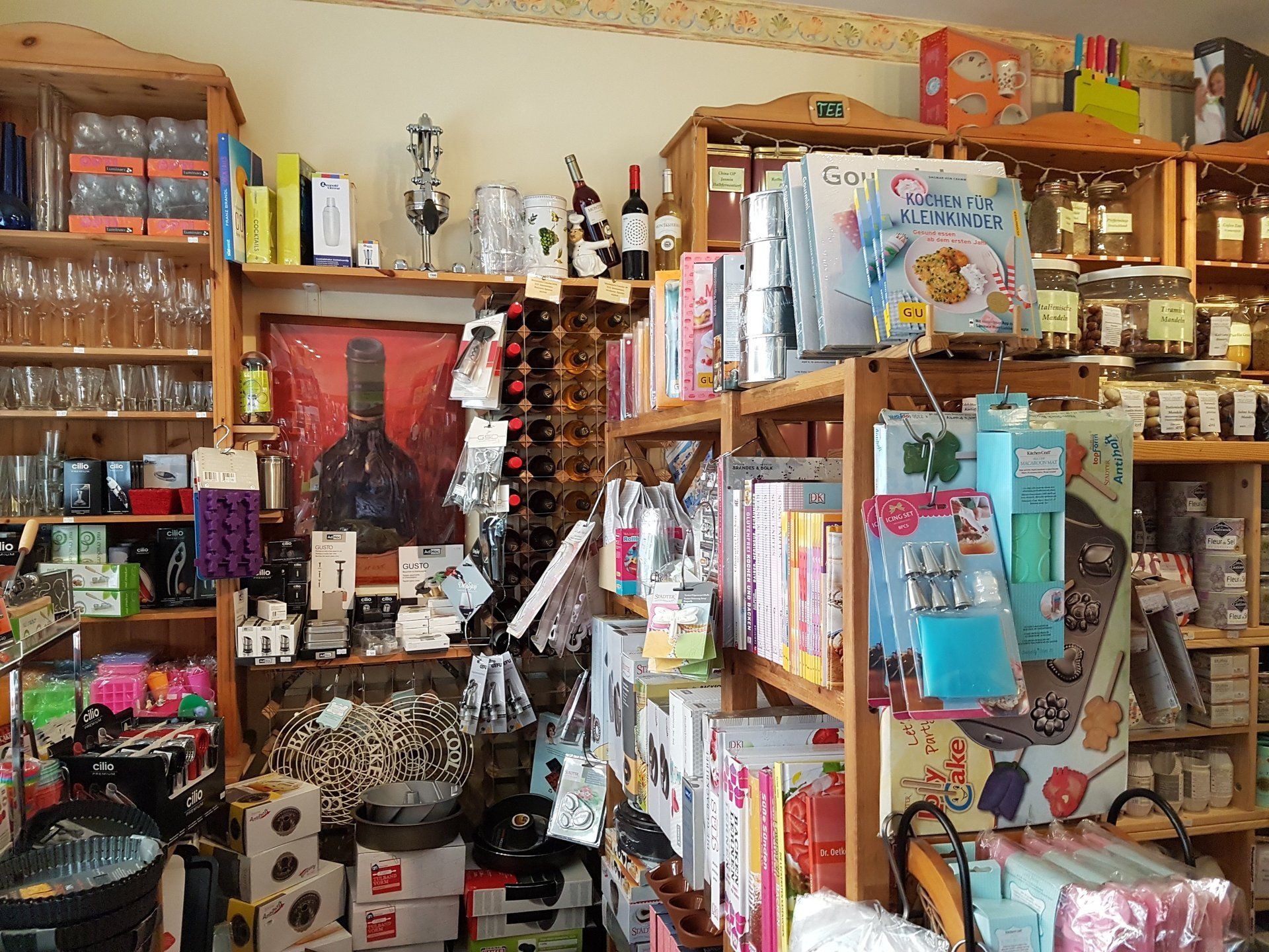 wie Reiben und Hobel aller Art, Pfeffer-, Salz-, Muskat- u. Gewürzmühlen, eine große Auswahl an Gewürzgläsern, hochwertige Töpfen und Pfannen, Schüsseln, Brotkästen, Bretter aus Holz und hochwertigem Kunststoff, allerlei Holz-Küchenutensilien, auch aus Olivenholz, Auflaufformen, Bräter, Messbecher, ein ausgewähltes Messersortiment, ausgefallene Küchenhelfer, wie Trüffelhobel, Austernbrecher, Spicknadeln, Zuckerthermometer und alle möglichen anderen Thermometer (Brateneinstich-, Flüssigkeit- Ofen-und Kühlschrankthermometer und vieles mehr...